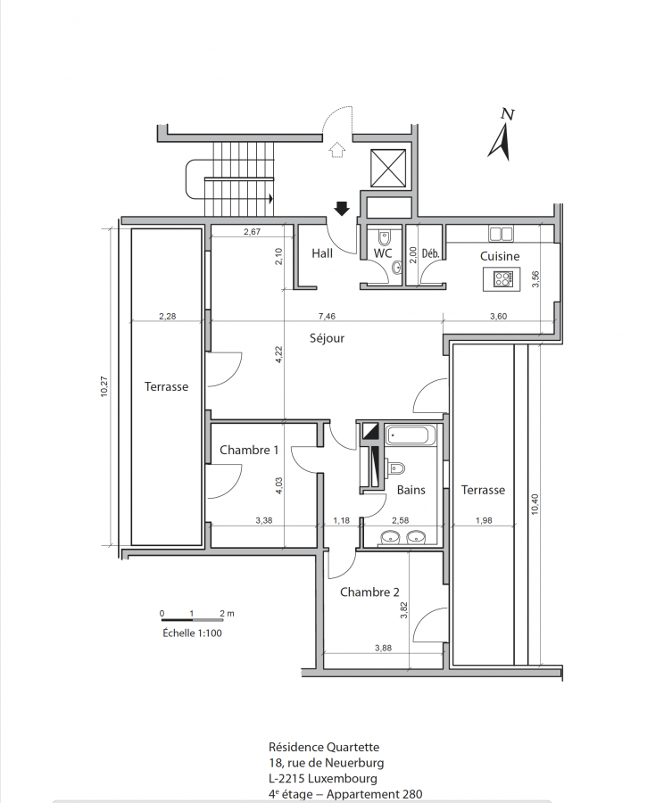Penthouse de 104 m2 au 4. étage avec une terrasse de 23m2 et 20m2 situé au 18, rue de NeuerburgLe penthouse se compose comme suit: